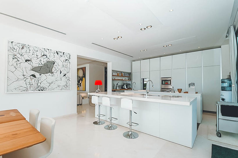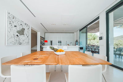 As you enter Villa Heidi, you will instantly feel at home with the wide, spacious and inviting bright open plan lounge, dining room and fully equipped modern kitchen which benefits from floor to ceiling glass doors, flooding the house with the warming natural light of the Ibizan sun. The all white theme abounds throughout the house, adding to the clean and stylish charm of this exquisite property. The refined soft furnishings have been carefully selected to complement the elegance of the house and are perfectly complemented by pops of colour from contemporary art pieces throughout. The bedrooms all boast inviting queen size beds with en suite bathrooms. The only exception is the sixth bedroom which instead is adjoined as a connecting room, perfect for families traveling with small children.