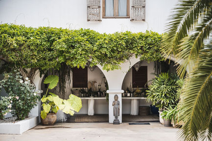 This exceptional villa is elegantly furnished with a sophisticated and luxurious decor that creates a sumptuous and palatial ambiance. The main living area features cool white walls and polished concrete floors, which are complemented by inviting decor. The sleek contemporary kitchen is fully equipped with modern appliances, and the formal dining room offers a peaceful view of the hacienda-style courtyard.